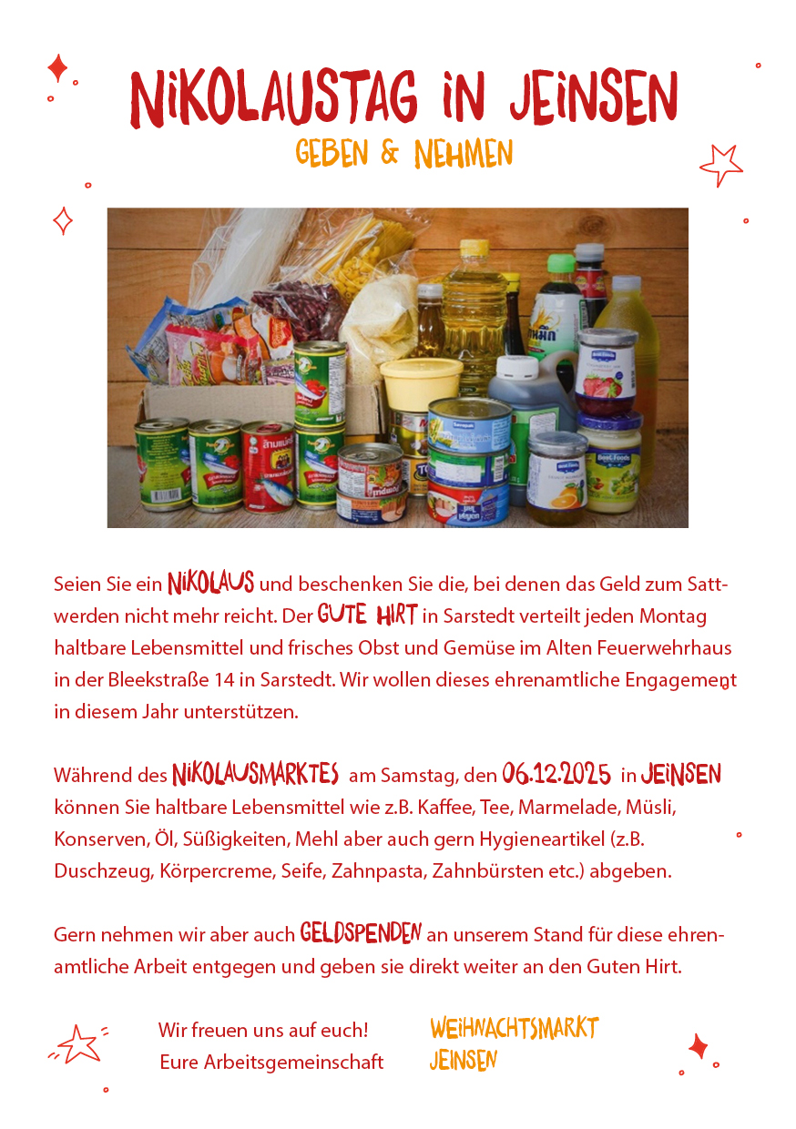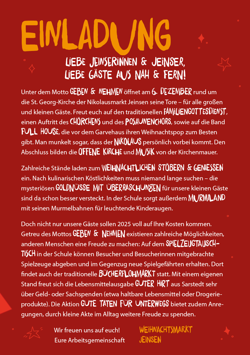 Jeinsen - ein Dorf zum Leben +++ Am Nikolaustag ist Weihnachtsmarkt in Jeinsen 6.12.2025 +++ Neueste Beiträge NOTFALL Karte NEU: Tickets online kaufen Sommerkino Pattensen Erfolgreiche Müllsammelaktion 2025 Team Karussellplatz im Einsatz Anstehende Veranstaltungen Nov. 19 19:00 - 21:00 Sitzung des Ortsrates von Jeinsen Dez. 6 14:00 - 18:30 Weihnachtsmarkt Kalender anzeigen