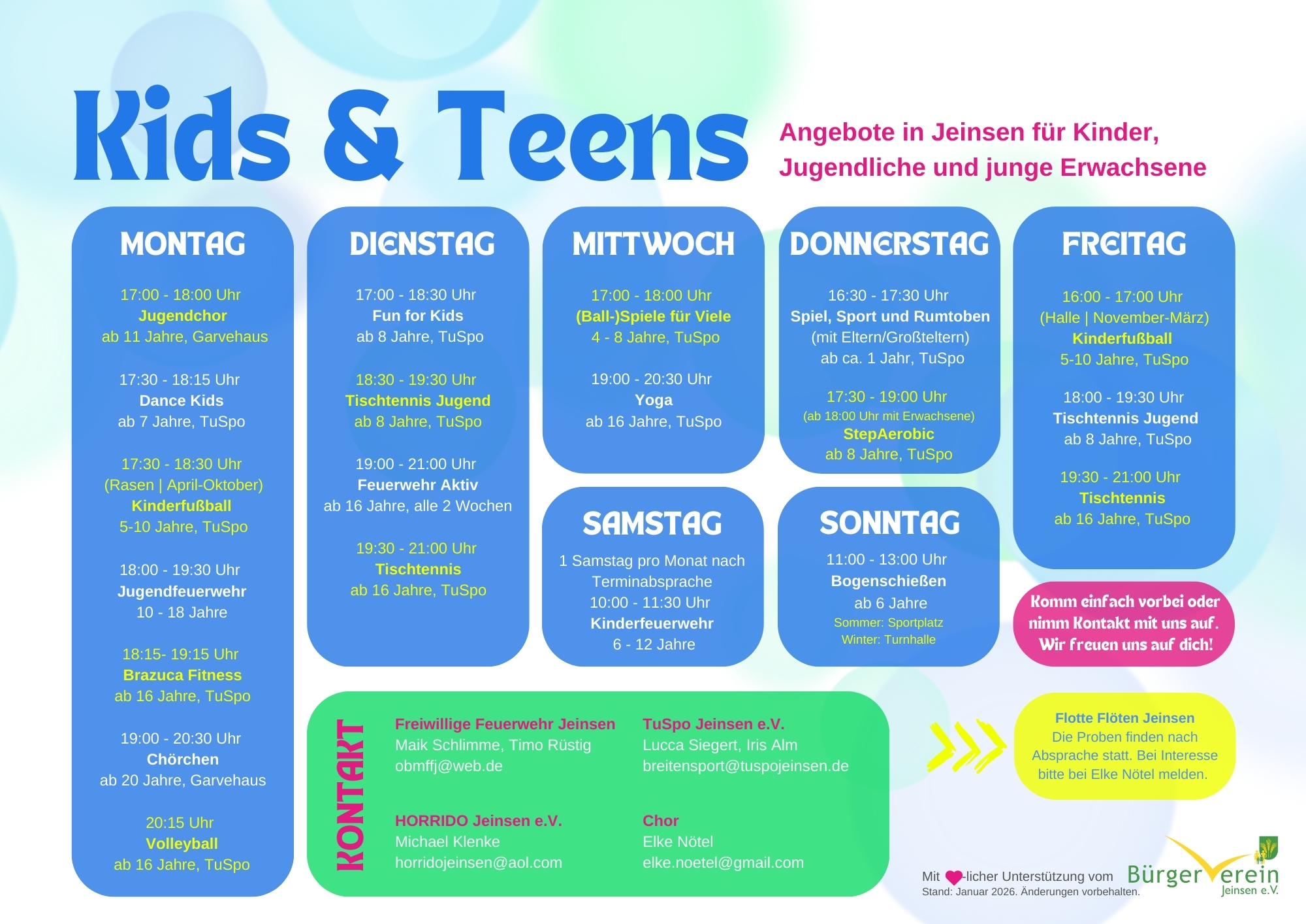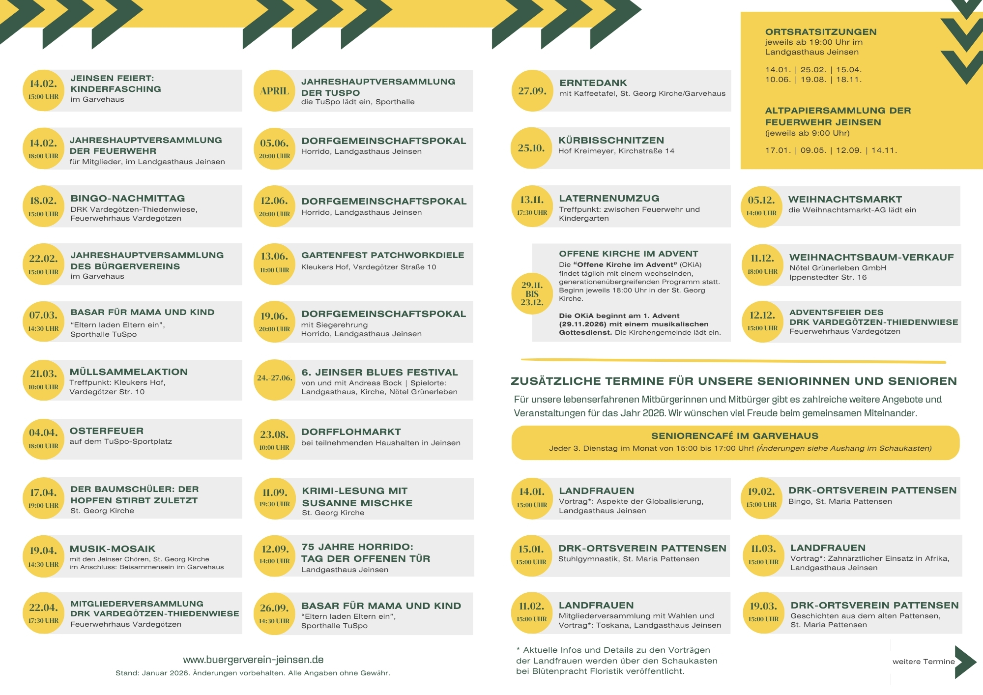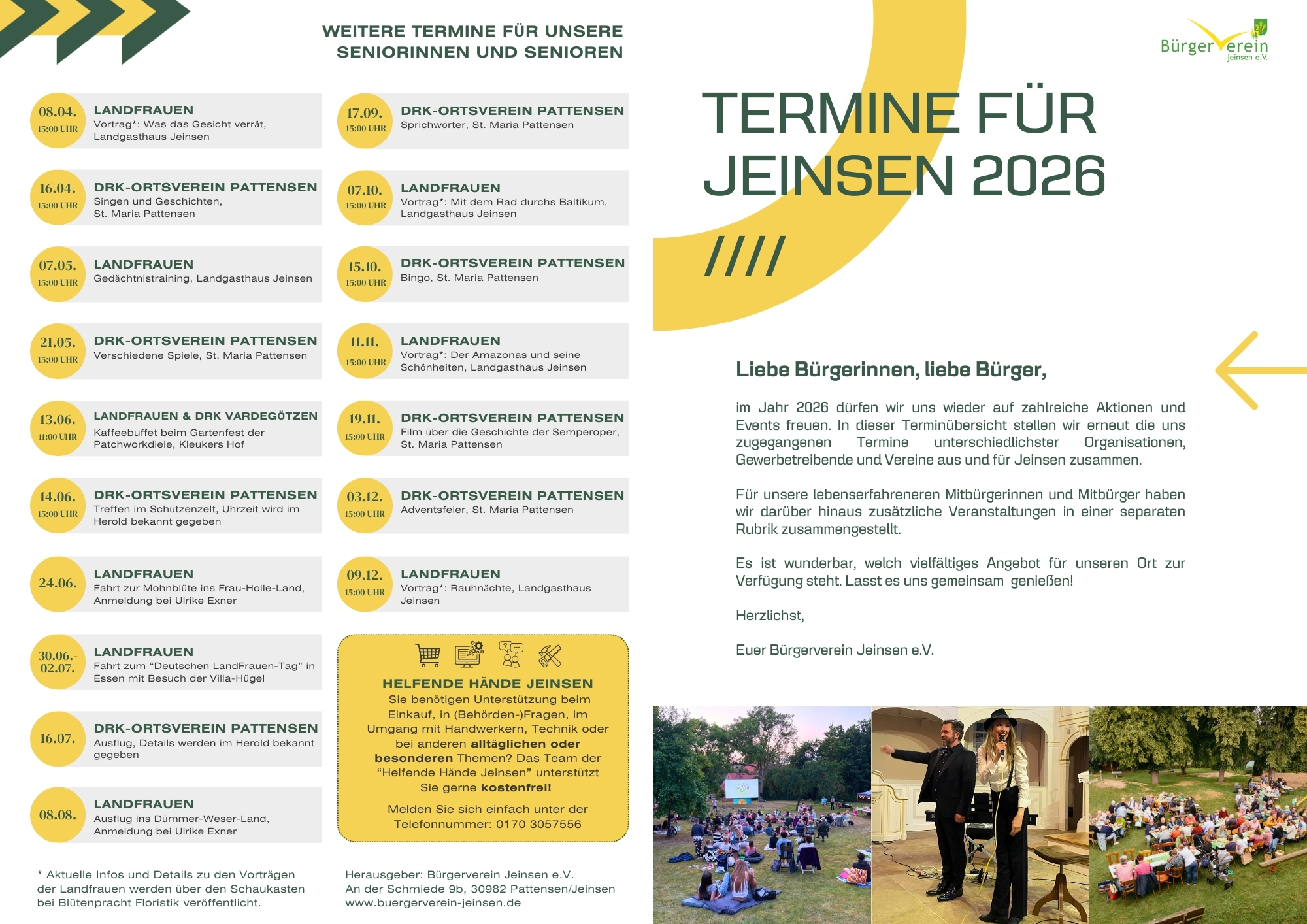 Jeinsen - ein Dorf zum Leben +++ Kinderfasching am 14.2.2026 im Garvehaus +++ Neueste Beiträge NOTFALL Karte NEU: Tickets online kaufen Sommerkino Pattensen Erfolgreiche Müllsammelaktion 2025 Team Karussellplatz im Einsatz Anstehende Veranstaltungen Feb. 14 15:00 - 17:00 Kinderfasching Feb. 14 18:00 - 20:00 Jahreshauptversammlung der Feuerwehr Jeinsen Feb. 18 15:00 - 17:00 Bingo Nachmittag Feb. 22 15:00 - 17:00 Jahreshauptversammlung des Bürgervereins Jeinsen Feb. 25 19:00 - 21:00 Ortsrat Sitzung März 7 14:30 - 17:00 Basar für Mama und Kind März 21 10:00 - 13:00 Müllsammelaktion Apr. 4 18:00 - 21:00 Osterfeuer Kalender anzeigen