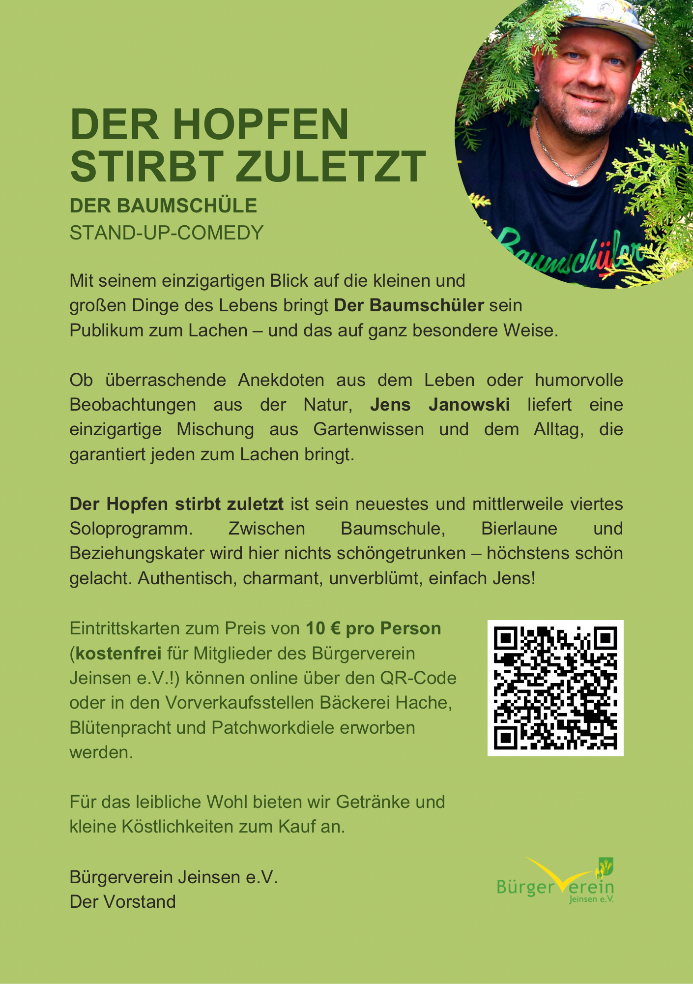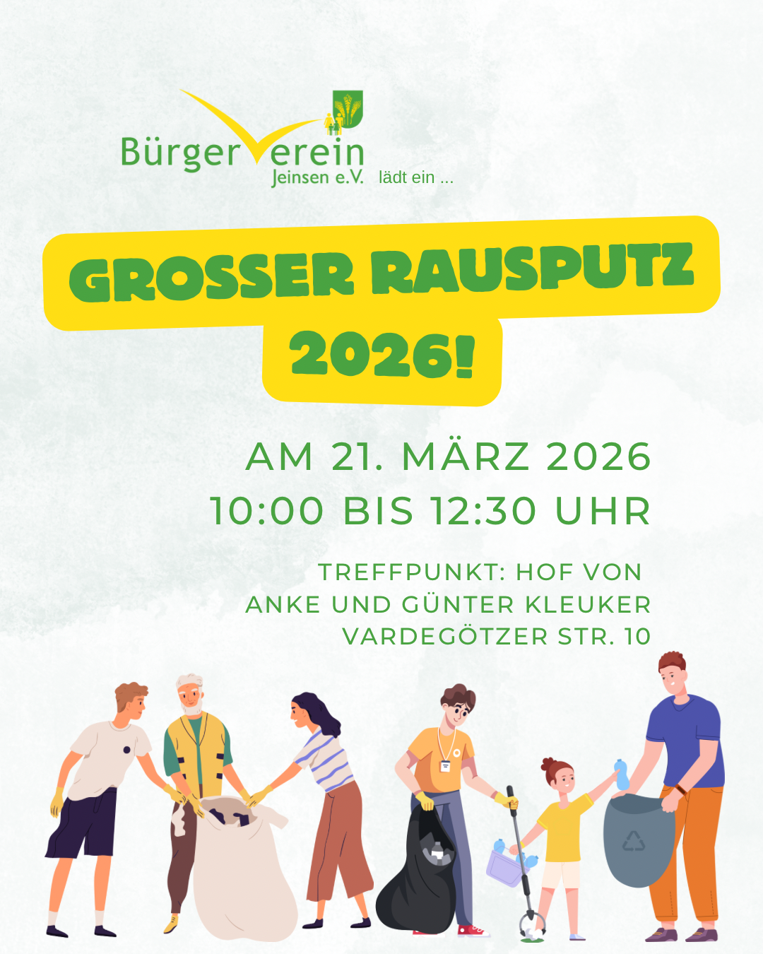 Jeinsen - ein Dorf zum Leben +++ Müllsammelaktion am 21.3.2026 +++ Neueste Beiträge NOTFALL Karte NEU: Tickets online kaufen Sommerkino Pattensen Erfolgreiche Müllsammelaktion 2025 Team Karussellplatz im Einsatz Anstehende Veranstaltungen März 21 10:00 - 12:30 Müllsammelaktion Apr. 4 18:00 - 21:00 Osterfeuer Apr. 15 19:00 - 21:00 Ortsrat Sitzung Apr. 16 19:30 - 21:30 Jahreshauptversammlung TuSpo Jeinsen Apr. 17 19:00 - 21:30 Der Hopfen stirbt zuletzt – Der Baumschüler Apr. 19 14:30 - 17:00 Musik-Mosaik Apr. 22 17:30 - 19:00 Mitgliederversammlung DRK Vardegötzen – Thiedenwiese Mai 9 9:00 - 12:00 Altpapiersammlung 2026 Kalender anzeigen