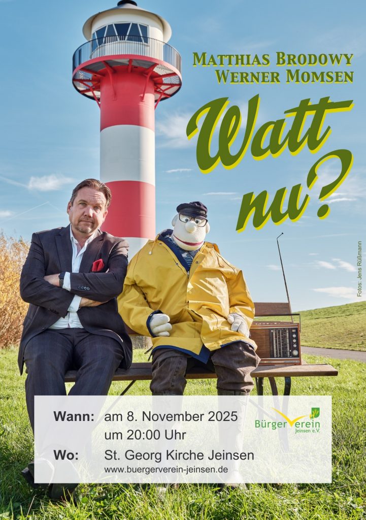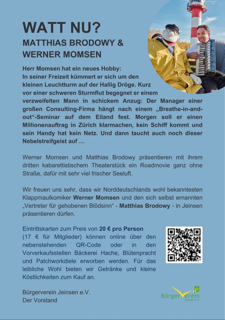 Matthias Brodowy und Werner Momsen sind bekennende und praktizierende Nordlichter. Ihr „Heimatabend“ ist wie das Land: Literarisch und musikalisch, komödiantisch und melancholisch, mit Augenzwinkern und Humor, der weitaus trockener ist als das norddeutsche Wetter. Die Zwei Nordlichter Momsen und Brodowy bringen mit Stand Up, Lesung, Musik und vor allem Schau- und Puppenspiel die endlose Weite ganz nah! Und sonst? …Och…-Zwei Nordlichter sprechen sich aus!